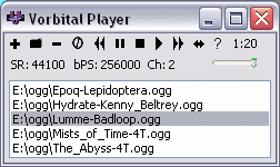 Vorbital is an Ogg Vorbis file player. It uses OpenAL and is small and compact in order to take up as little screen space as possible (though you can, of course, resize the window if you would like a larger playlist). The GUI was developed using wxWidgets.